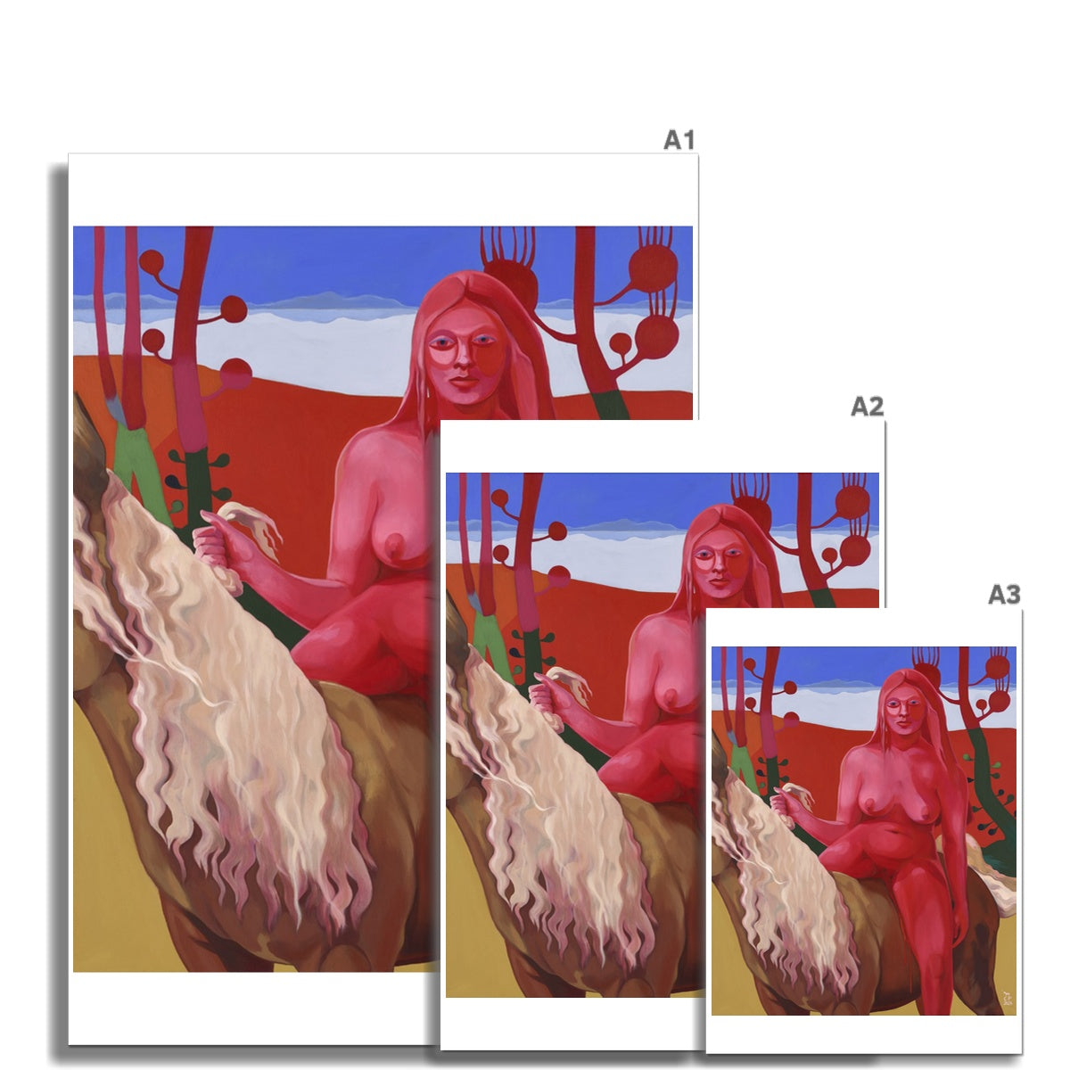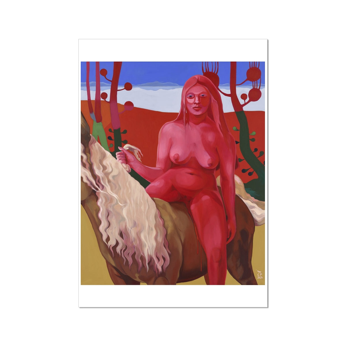 Yes, it's true, this woman is naked and she is sitting on a horse with her legs apart. Try to see beyond the body. It could also be the symbol of a plant in full bloom.