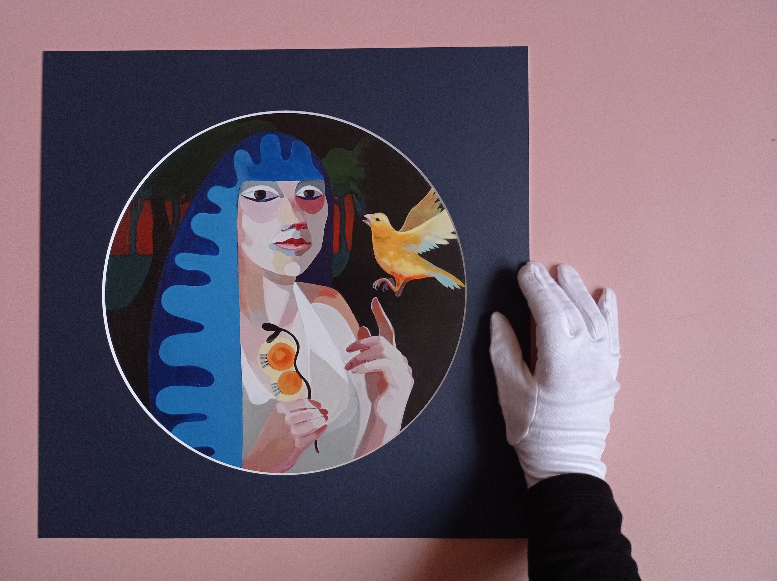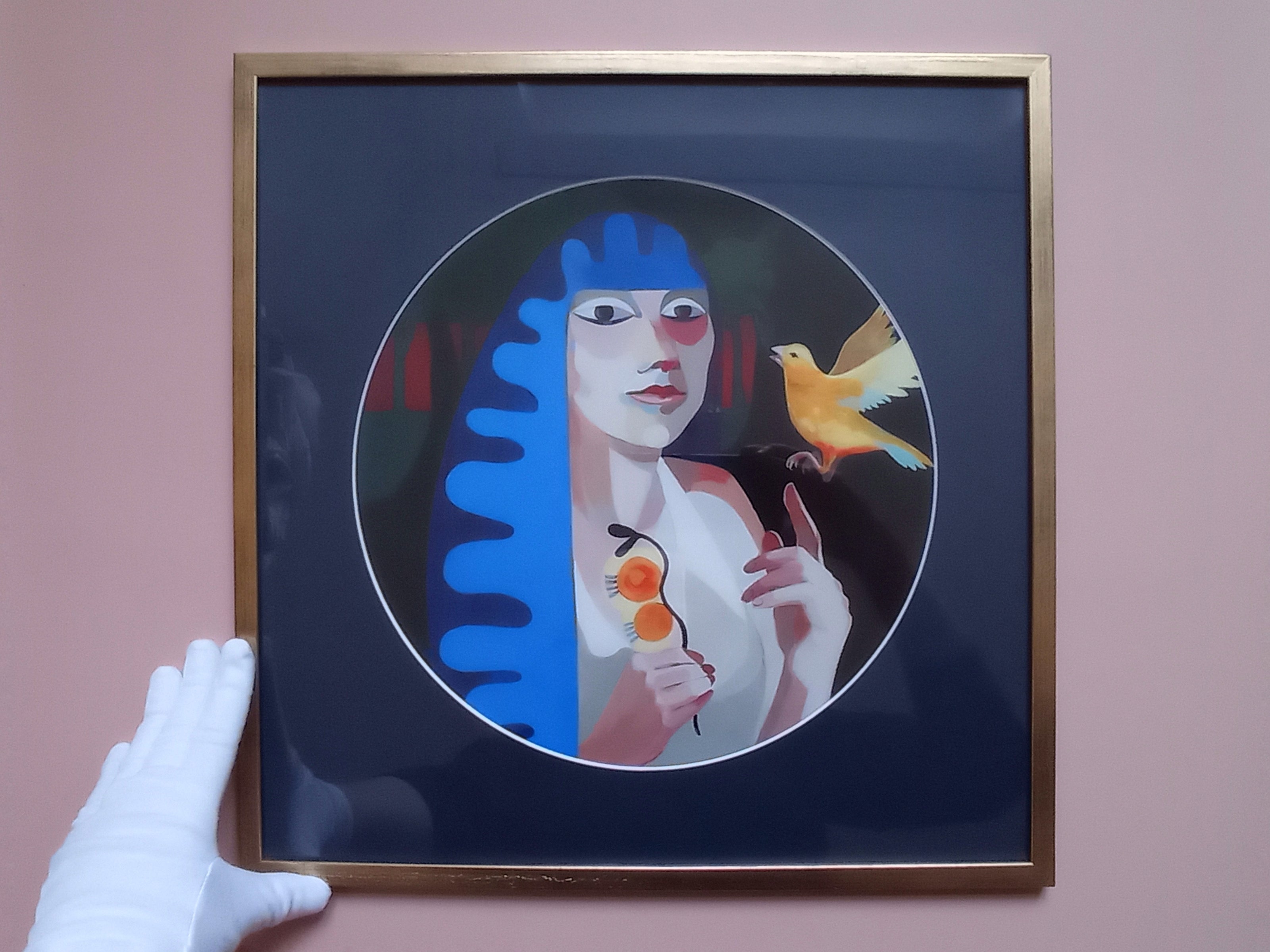 Dank des dunklen Passepartouts, leuchten Figur und Vogel.